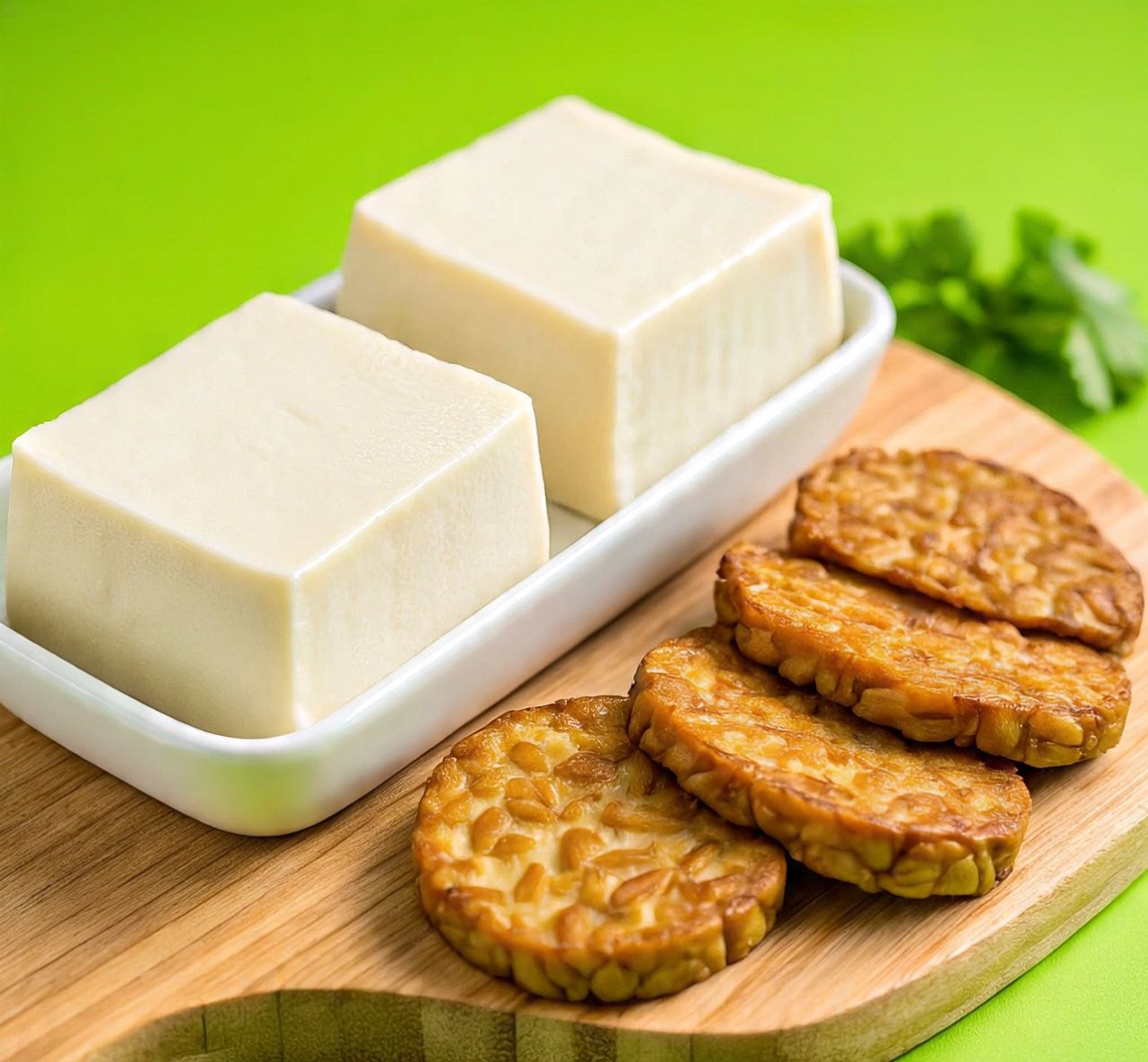 Tahu dan tempe terbuat dari kedelai, yang kaya protein nabati berkualitas tinggi.