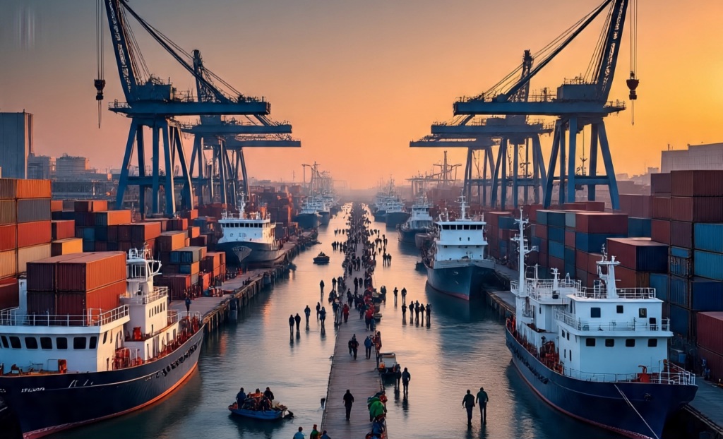Pelabuhan baru di Sumsel diyakini akan mengangkat dan mempercepat gerak putar ekonomi Indonesia. Foto: meta ai--