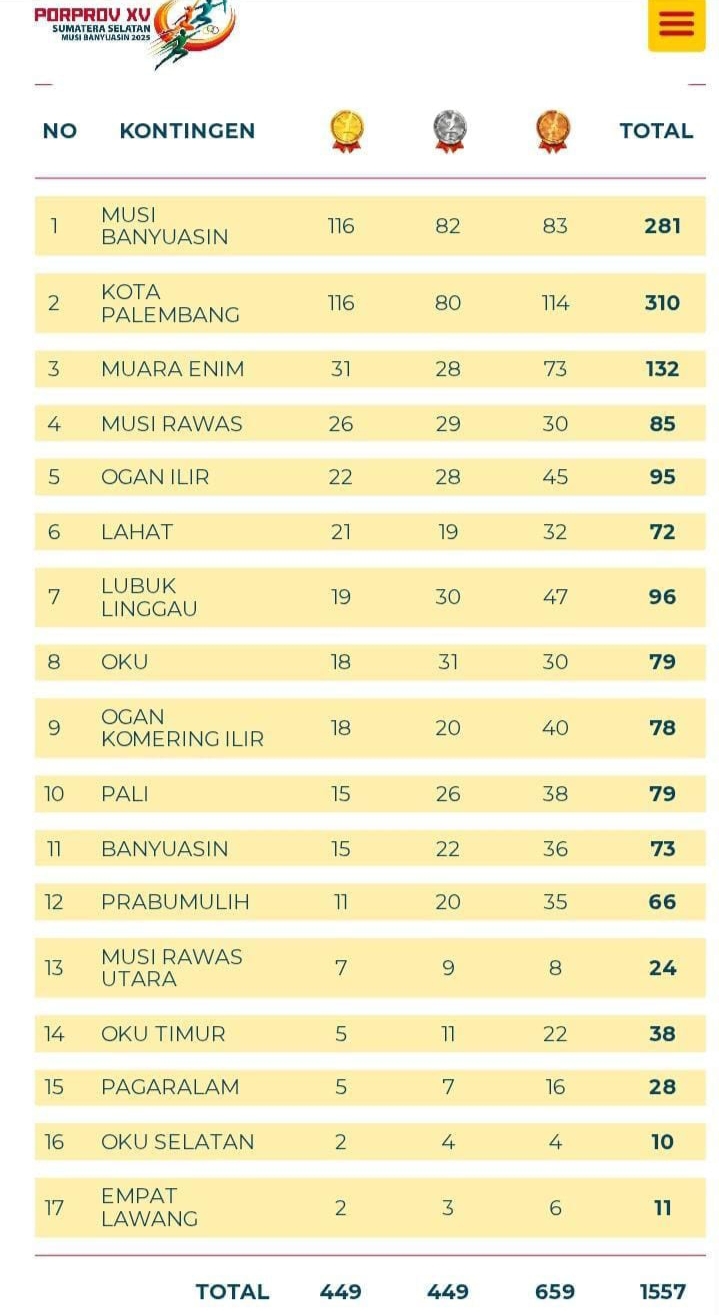 KORANENIMEKSPRES.COM - Kontingen Kabupaten Muara Enim terus menunjukkan taringnya di ajang Pekan Olahraga Provinsi (Porprov) XV Sumatera Selatan di Musi Banyuasin (Muba) dengan tetap kokoh menempati peringkat ketiga klasemen sementara, meninggalkan jauh kontingen lain yang berada di bawahnya, Selasa 28 Oktober 2025.